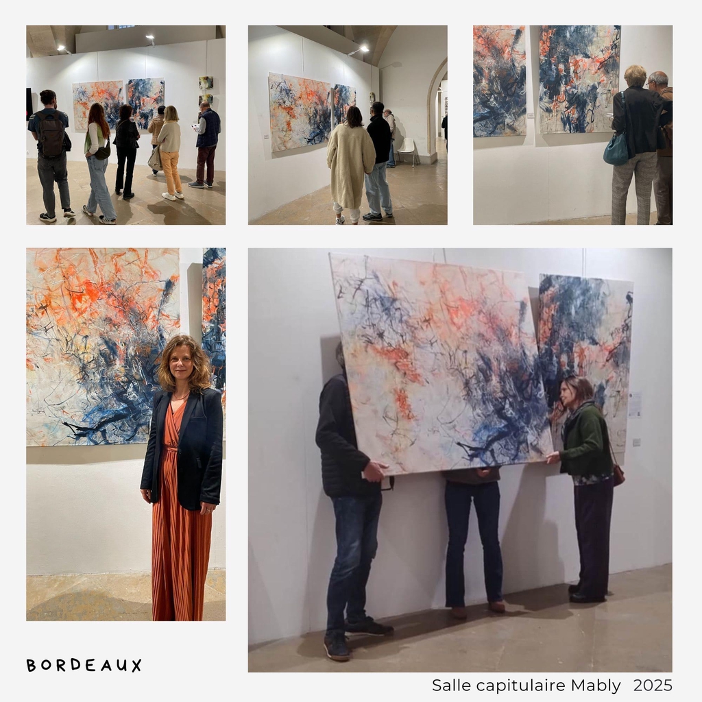 mon nouveau diptyque « En route 1 & 2 », le tableau « L’endroit à l’envers » - suspendu pour l’occasion… à l’envers ! 🙃 - ainsi que le diptyque « Trajectoire imprévisible », déjà présenté plus tôt cette année à l’Agora de Saint-Aubin-de-Blaye.